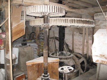 De molen bevat twee waterraderen, één ongebruikt (dat van de voormalige olieslagerij) en één voor de nog werkende graanmolen. De olieslagerij en de graanmaalderij zijn twee afzonderlijke, herhaaldelijk aangepaste (merkbaar aan de bouwnaden) gebouwen. Deze staan aan weerszijden van de thans ingebouwde (o.m. om ijsgang tegen te gaan) houten raderen.