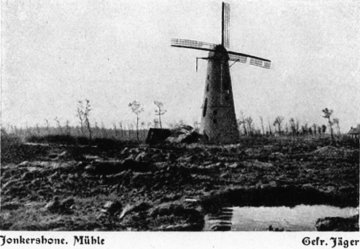 Jonkershove lag tijdens de die oorlog volop in de frontlinie. De hoge stenen stellingmolen en de kerktoren van Jonkershove dienden als uitkijkpost van de Duitse troepen en werden in 1916 beschoten door de geallieerde troepen. Op een foto van 1916 zien we de beschadigde molen, die toen nog wel zijn wiekenkruis had. Op deze foto bemerken we aan de linkerkant van de weg loopgrachten van de Duitse soldaten. Juiist voorbij de molen stond het huis van onderwijzer Serafijn Schotte. Molenaar Henri Castelein werd door de Duitsers geëvacueerd naar Staden waar hij kort na de oorlog (op 7 februari 1919) overleed. Zijn weduwe Barbara Sophie Syoen keerde terug naar Jonkershove waar zij op 21 december 1936 overleed.