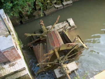De waterraderen: een onderslagrad bestaande uit aaneengeboute profielen en met stalen as en gietijzeren hart, een geklonken bovenslagrad, op grotere afstand van de molen, is thans in verval. Dankzij de combinatie van een onder- en een bovenslagrad kende deze molensite een bijzonder hoog rendement door een maximale benutting van zowel een hoge- als lage waterstand.