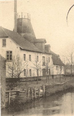 Ce complexe doit avoir été construit au début du 19e siècle: il ne semble pas figurer sur un plan de la paroisse de 1784 mais est mentionné dans le cadastre primitif de 1835 (section C, parcelle 783) comme moulin à grain appartenant à Jean-Baptiste Froidure, fabricant d'huile à Comines. Par mariage, le moulin passa à la famille vander Mersch, qui l'exploita jusqu'à sa destruction au cours de la guerre de 1914-1918. Il ne fut évidemment pas reconstruit. Vers 1900, une turbine avait remplacé la force éolienne et cette modernisation avait provoqué la disparition du moulin dont ne subsista plus dès lors que la base, toujours aussi inattendue sur son toit.