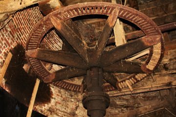 * kollergang (1 loper ligt naast de kollergang) met ijzeren steenspil en ijzeren steenwiel met nog deels aanwezige houten kammen