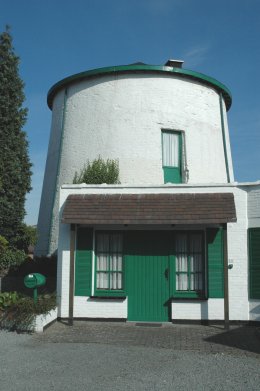 Deze stenen bergmolen heeft een vrij brede romp en was voorzien van een zetelkap met oversteek boven het kruiwerk.