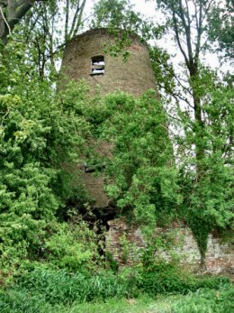 Thans rest nog verscholen door omringende populieren: niet afgedekte ingekorte conische bakstenen molenromp op molendam met bakstenen ommuurd. Behouden getraliede vensters (deels gedicht) van drie bovenverdiepingen boven beide poorten: overblijvend metselwerk van hun vroeger overwelfde doorrit in de belt. Binnenin rsten enkel nog een paar balken van de drie ingestorte balklagen.