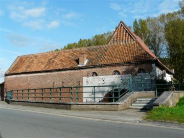 Ten zuiden, woning met molenhuis, van vijf traveeën onder steil zadeldak (nok loodrecht op straat, Vlaamse en mechanische pannen), uit de 17de eeuw (dakhelling, muurankers, rondboogdeur). Witgekalkt gebouw op een gepikte plint; gesmeed ijzeren muurankers. Recenter laadvenster boven de derde travee; kleine rechthoekige, houten kozijnen; een rechthoekig, gecementeerd venster en een gelijkaardige deur; de ingang tot het molenhuis wordt gevormd door een verankerde kalkstenen rondboogdeur met negblokken. De achtergevel heeft twee houten kloosterkozijnen, een klein getralied venster met houten latei en onderdorpel, en een rechthoekige deur in een houten omlijsting, met een houten kaasrek onder de dakrand, boven de deur. De westelijke zijgevel heeft een pannen beschieting in de top; ertegenaan, in het verlengde van de buitenmuur der westvleugel werd één travee onder lessenaarsdak aangebouwd; het grootste gedeelte der buitenmuur is van kalksteen; hier bevindt zich het metalen molenrad; in het bovenste, bakstenen gedeelte zijn drie halfronde venstertjes uitgespaard; de datering 1837 door middel van muurankers verwijst naar de bouw van dit molenhuis, mogelijk ook naar de bouw van de hele westvleugel.