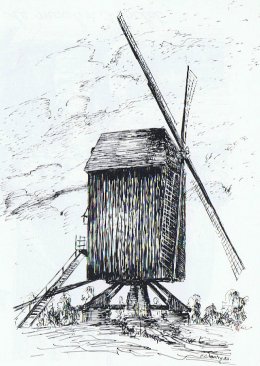 Moulin dou Manne, Moulin d'Oumane, Mainvault (Ath), Natuurgetrouwe pentekening Fernand Chantry naar oude foto | Database Belgische molens