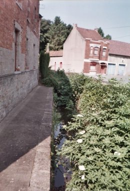 Le secteur de la cour Pelletier, à l'angle de la rue Levecq et de la rue Sans Raison, présente une configuration assez proche de celle qui annonce habituellement un moulin. C'est un canal artificiel (Grand Courant) qui se trouve ici au centre de la localité et à l'approche d'un édifice trahissant un certain prestige.