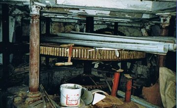 L'eau atteint d'abord, à l'amont du moulin, un bassin daté de eaux issues. La première, en forme de porte surmontée d'un linteau (où se voit encore le trou de la crémaillère), permettait d'admettre l'eau vers les installations hydrauliques. La seconde issue, faisant également office de trop-plein, servait à faire monter le niveau de l'eau dans le canal d'alimentation. Après avoir franchi la première issue, l'eau spécialement destinée au moulin se trouvait devant deux autres accès: le premier, protégé par une grille, conduisait l'eau vers la roue (de ventre?) du moulin. L'axe métallique de cette grande roue est toujours en place au dessus du logement qui lui était réservé.