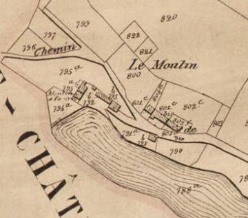 Op de Kadastrale Atlas van P.-C. Popp vinden we de "Moulin à farine à eau" op het perceel Nalinnes Secite D nr. 793a in het bezit van Gillain, Lucien, bourgmestre, Joncret.
