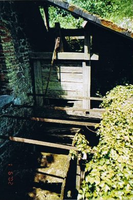 Vers la droite du moulin, bief conservant une vanne de pierre et la roue à aubes en bois.