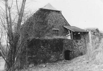 La façade du moulin est très parcimonieusement percée d'une petite porte surmontée d'un lucarne passante à usage de monte-charge. Une fenêtre qui pourait être du 18e siècle éclaire également le rez-de-chaussée. Porte et fenêtre sont encadrées de brique, ce qui pourrait trahir des percements tardifs. Les angles en belles pierres taillées et assisées indiquent que le bâtiment a été construit - peut-être pour être seul - avant la maison elle-même.