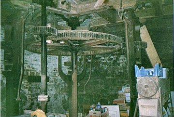 La roue métallique, quoiqu'assez dégradée, est toujours en place. Il en va de même pour le canal, fait de planches, qui amenait l'eau sur le sommet de la roue, type roue dessus.