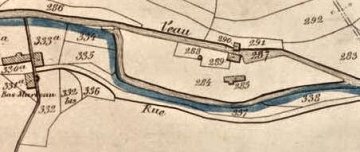 Op de Kadastrale Atlas van P.-C. Popp (ca. 1860) vinden we deze "moulin à eau" op het perceel Thuin D289 in het bezit van La Troye, Stanislas-Charles et enfants, propr., Thuin. Onder datzelfde art. 402 staat ook de Moulin du Bas-Marteau (zie andere webpagina).
