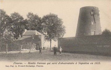 Le 16 juin 1815, vers onze heures, l'Empereur, venant de Charleroi, entre dans Fleurus et décide, après avoir pris une collation à l'auberge de la Barrière, de faire du moulin Naveau son observatoire.Les uns prétendent que l'Empereur fit pratiquer, par ses sapeurs, une brêche dans le toit à coups de hache ; les autres, qu'il se contenta de monter sur une plate-forme aujourd'hui détruite et qui occupait à peu près l'emplacement du balcon.