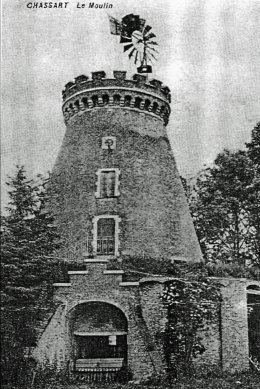 Erigé en 1831 sur cette terre chargée d'Histoire, à deux pas des Anciens Etablissements de Chassart, entreprise agro-alimentaire liée à l'industrialisation du Royaume et connue pour son célébre geniévre, le Moulin a connu de multiples fonctions: de moulin à vent pour moudre le grain, il fut transformé fin du 19éme siécle en bâtiment rural, servant à pomper l'eau pour abreuver le bétail des deux fermes environnantes. A l'arrivée des troupes françaises en août 1914, l'armée y installa un poste d'observation.