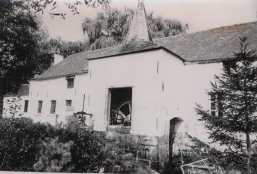 - Witgekalkt gebouw, afzonderlijk torentje met het waterrad
