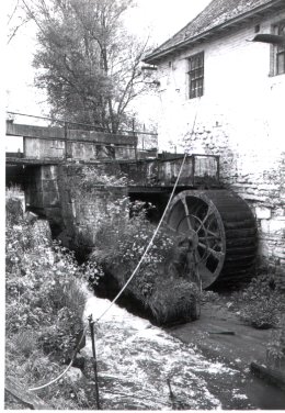 Watermolen met metalen bovenslagrad op de Dijle stroomopwaarts van de kerk.