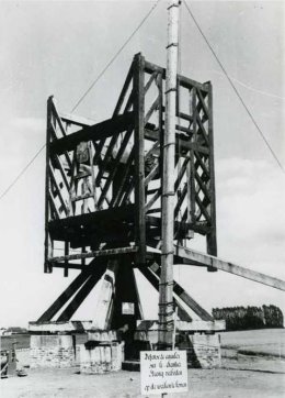 Description: Black and white negative and print made from it of an open trestle post mill, known as 'Moulin d'Argenteuil', 'Moulin des Baraques' or 'Moulin de Broc et Bo' in Ohain in Belgium, showing a ~ rear view, taken on 4th January 1945.
