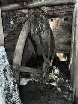 Roue à eau sous abri désaxée.