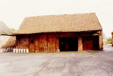 Ten oosten, achterin gelegen wagenhuis van vier traveeën in verankerde baksteenbouw onder sterk overstekend pannen zadeldak, aan de erfzijde op houten schoren (nok evenwijdig met de straat). Erfgevel met vier aaneengeschakelde en deels gedichte korfboogpoorten op pilasters met geprofileerde imposten.