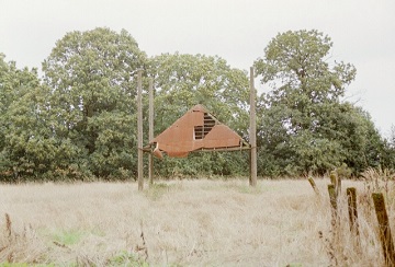 Hooiberg ten noordoosten van de hoeve. Verschuifbaar tentdak met houten dakconstructie en deels verdwenen dakbedekking, rustend op vier hoge palen.