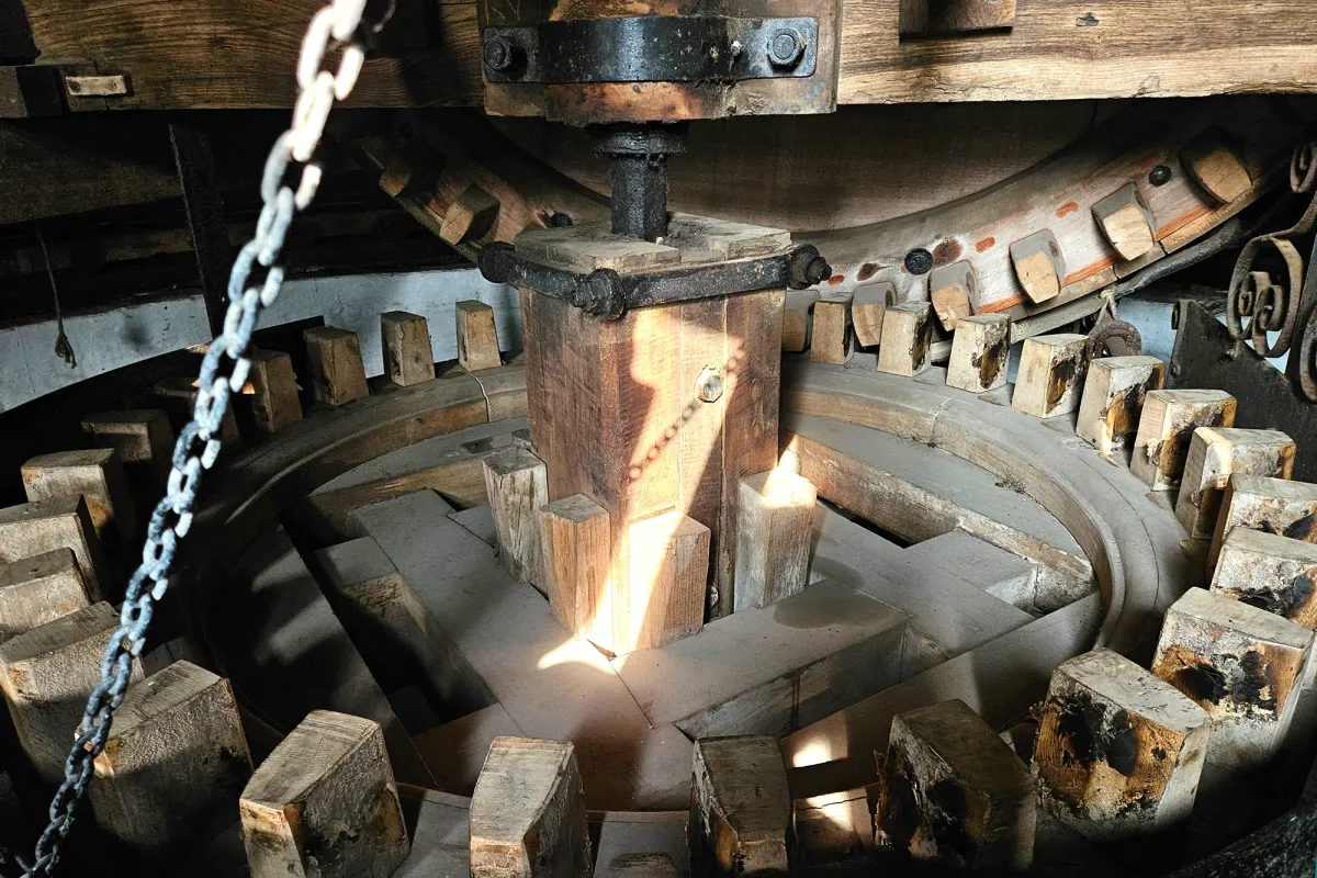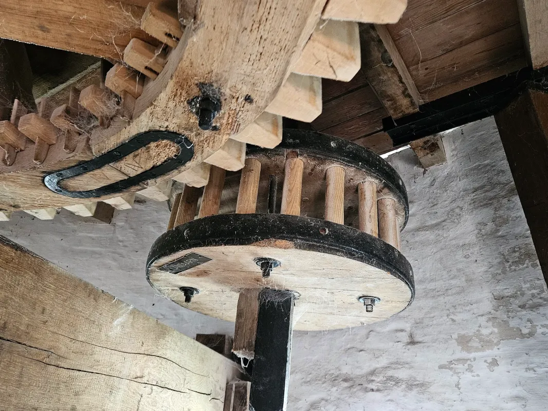 Uit de tijd van de staakmolen herinneren nog de molenijzers: het ene heeft als inscriptie "Nouviaire Fondeur en fer Bruges", het andere "P.D.L." en "1772". Ook de teerlingen van de staakmolen steken nog onder de huidige molenmuur!