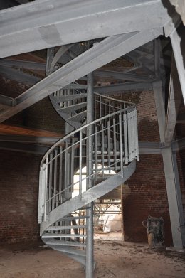 Ter hoogte van de tweede zolder, voorheen ijzeren gaanderij, cf. bewaarde stellinggaten. Benedenverdieping: rondboogpoort (straatzijde) en dichtgemetselde dito deur. Ter hoogte van deze deur (zuidwestelijke zijde, cf. beschietingen), parementschade die naar boven toe uitloopt in een scheur die steeds breder wordt waardoor er ter hoogte van de derde en vierde zolder slechts één derde van de omtrek van de romp bewaard is.