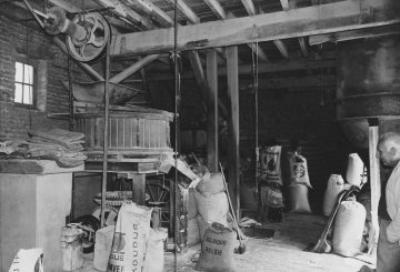 Binnenwerk: op turbine-as drijfriemen naar dynamo en naar drijfwerk molen. In het linkergebouw bevindt zich een eenvoudige horizontale asoverbrenging met, van links naar rechts: riemschijf en drijfriem naar luiwerk; kamwieloverbrenging naar verticale as voor maalstoel; aankomst van drijfriem vanaf turbine-as, op riemschijf; riemschijf en afdrijfriem naar additionele elektromotor; riemschijf en drijfriem naar elevator; riemschijf en drijfriem naar haverpletter; kamwieloverbrenging naar verticale as voor maalstoel.