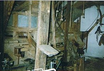 Binnenin. Tweekamer-diep molenaarshuis, met behouden indeling en dragende structuur. Oude samengestelde balklaag nog aanwezig, maar met ander materiaal bekleed. Interieuraankleding jonger. De watergevel van het molengebouw werd in 1990 bezet met een roodgeschilderde beplanking waarin twee bovenvensters uitgespaard zijn. De onderbouw van de watergevel in massieve natuursteenblokken is evenwel nog duidelijk zichtbaar.